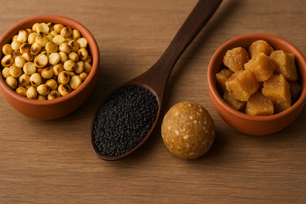 - எள்: சத்தான கொழுப்பு, தாது மற்றும் நரம்புகளுக்கு ஆதாரம்.
