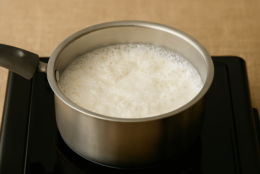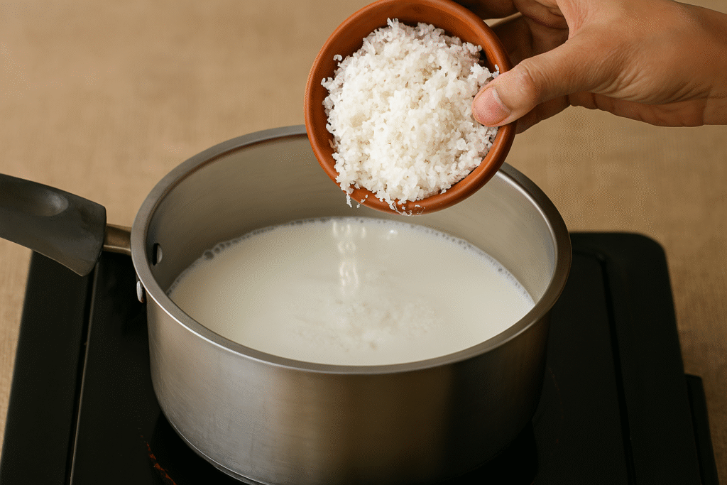 - பால் கொதிக்க ஆரம்பித்ததும், துருவிய தேங்காயை சேர்க்கவும்.