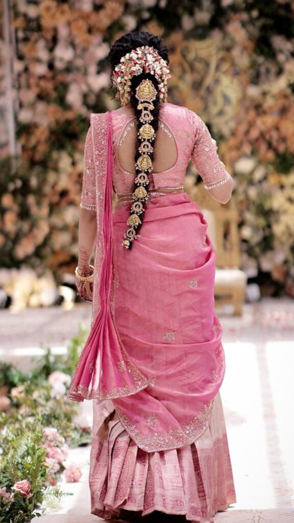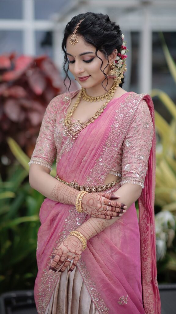 முடி ஸ்டைல்: பின்னல், கொண்டை, பூ வைக்கிறது எல்லாம் பாரம்பரிய ஸ்டைல். Curls, wavy style பண்ணாலோ நல்லா இருக்கும். பன் (bun style) போட்டாலும் அழகா இருக்கும்.